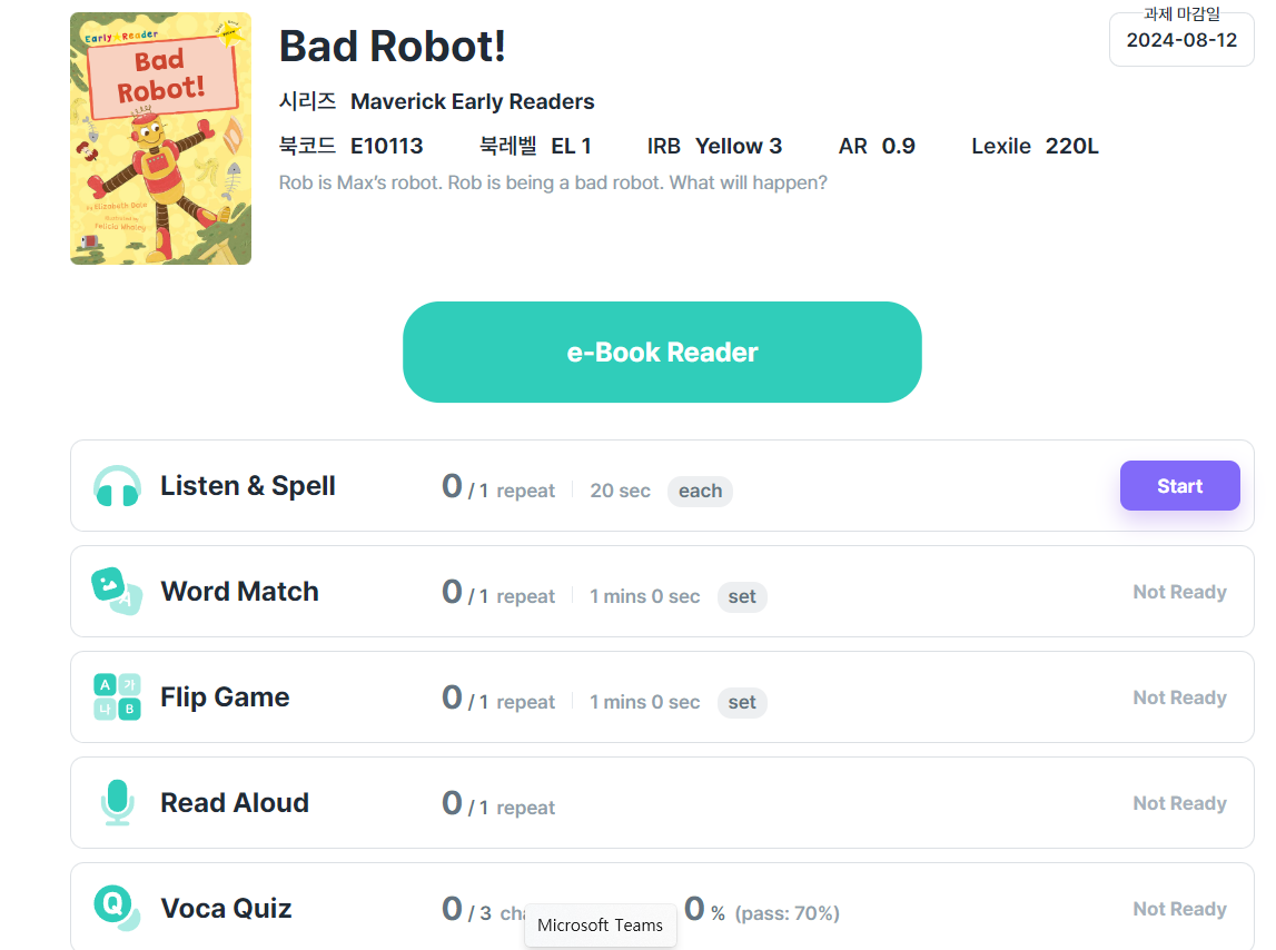 아래와 같이 녹음도 나가고, 듣기, 단어, 리터러쉬 퀴즈가 아이에 맞게 선택적으로 나가게 됩니다.