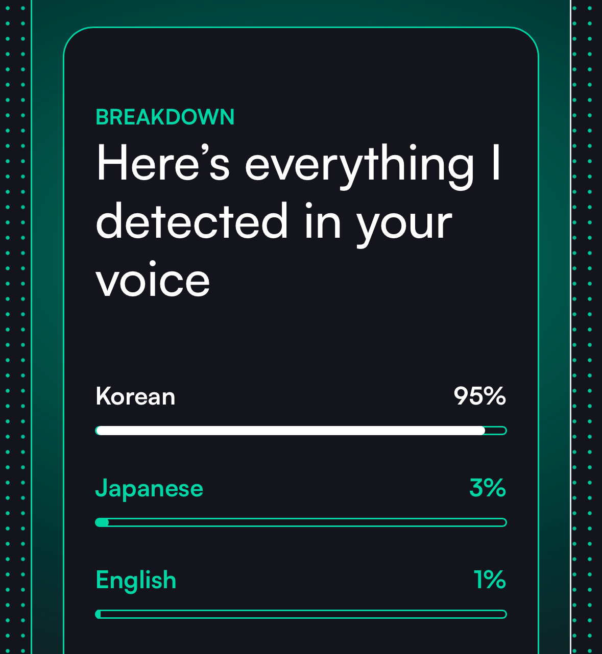 흥미로운 점은 영국에서 태어나 영어를 모국어처럼 구사하는 제 딸이 테스트를 했을 때 즉각적으로 "English"로 판별되었다는 것입니다. 딸의 발음은 영어 원어민으로 인식된 반면, 저는 다양한 악센트로 분석되었다는 점에서 발음과 악센트의 미묘한 차이를 실감할 수 있었습니다.